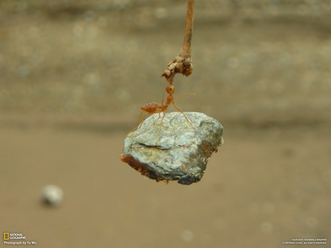 I found this picture while I was browsing through Reddit today. Just simply amazed looking at the picture. The ant is biting the branch and holding the rock in the air. This picture has been taken by Yu Wu in China.