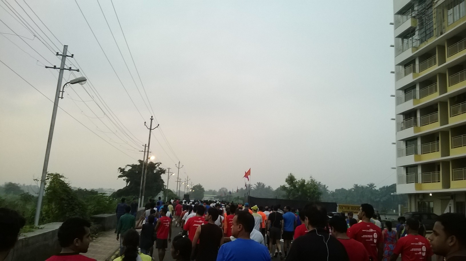 Last mentioned in my previous post, I was in two minds whether to run the half marathon or no. I hadn’t been practicing since the entire last month and was not too comfortable running the half marathon. Post a lot of persuasion by my brother, I decided to run the race, even though I was not at all prepared for it. The night before the race, I also caught cold, even though it wasn’t too serious to be worried about. Sunday morning came very early for me (4:30am, time when I am usually going off to sleep). Got ready to head for the race with my brother, who was super charged up. Met P along the way. He was running his first marathon, but he was prepared as he had practiced enough. We reached holding area at around 6:20am and did some warm up for the race to begin at 7am. We slowly moved towards the start line and in between I got to see a beautiful sunrise. There were a lot of people who were participating in the race and it was good to see so many people turn up for running. Indian’s are normally not known to run and all, even though we produced the Flying Sikh. So it was nice to see so many people turn up for this event, though this was a fraction of what turns up at the Mumbai Marathon.