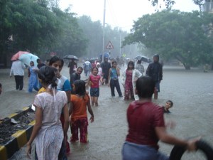 It all started this morning at around 3-4am. I got up at around at 7 am and saw the sky was grey as ever and it was steadily pouring. At around 8:15am, my brother called saying that the trains are not working and he is coming home. He had left for college early in the morning only to go two thirds of the distance and then return home wet. My colleague was supposed to fly down to Mumbai today morning and she had to cancel her flight. She was on the call with me all through out. I told her that the trains are not working but so far nothing else seems to be effected. Slowly the reports started to come by and certain low lying areas were flooded. My bro was back home and he said lets go to the nearby mall and catch the 10am show. I was like sure. We left our houses only to be surrounded by knee deep water in our area. We decided to watch Awarapan (the movie sucked). After the interval the electricity went off and so after waiting a while, we got our refunded for the movie. In a wa, I feel lucky.. i got to watch half the movie and got paid full money back. While returning we decided to walk through the effected areas to get the first hand view of how bad the things were. What we saw, was something which was very different. Today being saturday, most people had decided to stay home and once the street were flooded almost every one was down enjoying the rains. I guess this only happens in Bombay. Streets had turned into open rivers. There were kids, men, women, husbands, wives, grandmom, grandpa’s all out in the rain enjoying the water filled streets. Some people used to the street to play cricket. It was a festive atmosphere all throught out. The chaiwalas (tea vendors), bhajiawalas did brisk business today. We could see people standing outside at the local eatery grabbing a bite of the hot samosas and bhajias. Inspite of all the fun and frolic, I do feel sad for the people whose houses were filled up with water and also for poor who had basically nothing but a plastic roof on their heads. I saw one man just holding his head and sitting in his little hut with water all around. It is true when a calamity happens, the people who get affected the most are going to be poor.